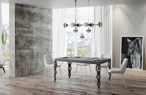 Karamay Fix 180×90 cm, un Tavolo da pranzo dalla linea esotica e raffinata grazie alle particolari decorazioni delle gambe. Un modello in grado di arredare in modo eccentrico qualunque ambiente: cucina o soggiorno. Il telaio in metallo conferisce solidità alla struttura anche sotto sollecitazioni. Il piano in microparticelle di legno è lavorato a folding, una tecnica capace di offrire un risultato estetico di alta qualità.