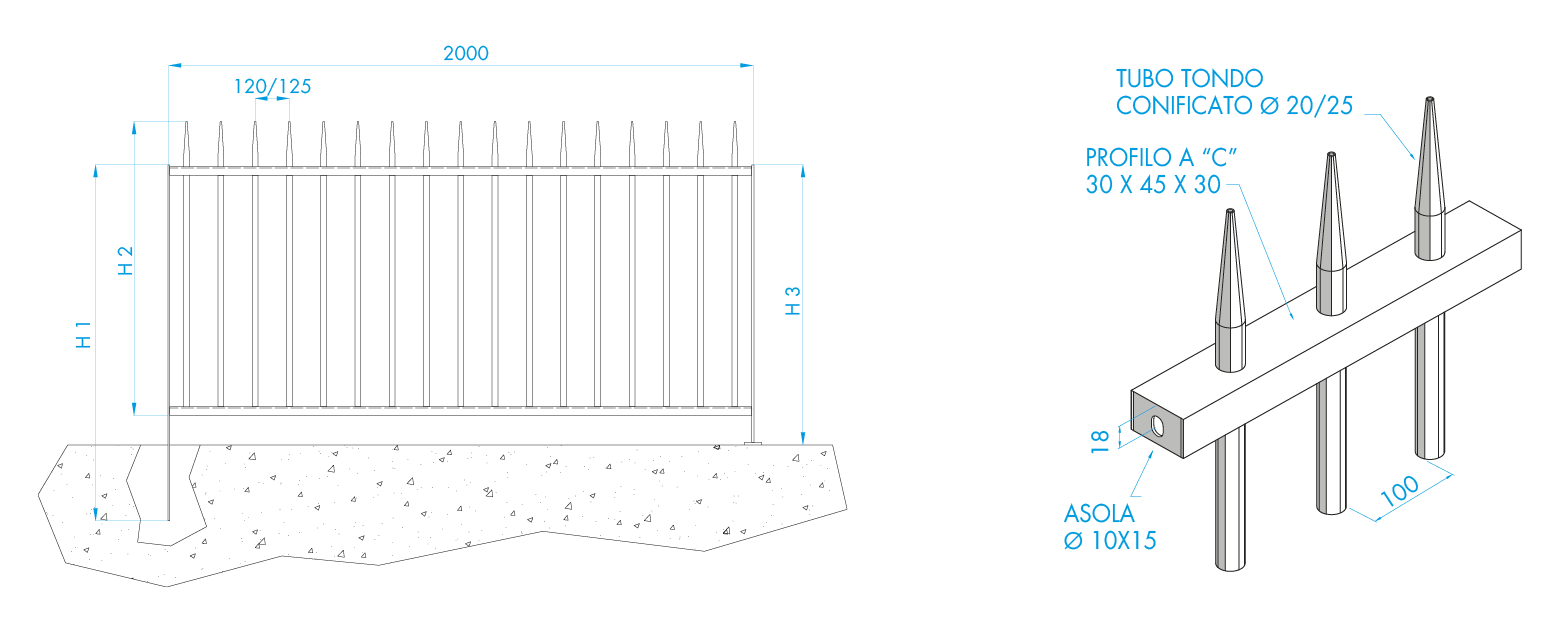 Viene ampiamente utilizzata sia in ambito residenziale che industriale. Zincata a caldo , viene crostruita con profili orizzontali a 'C' 30x45x30 mm e con profili verticali passanti in tubo conico di ø 20/25 mm , saldati direttamente ai profili a 'C'.