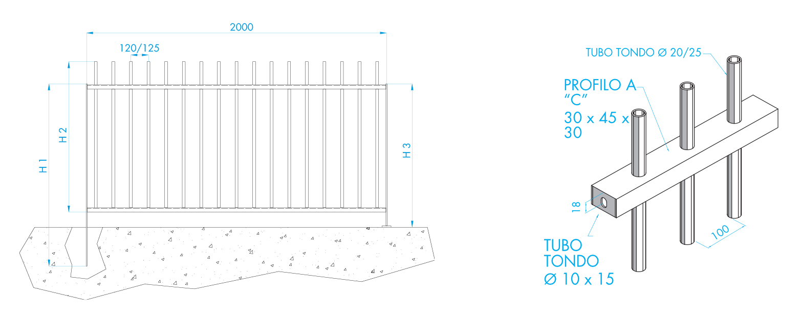 Zincata a caldo , viene costruita con profili orizzontali a ''C'' 30x45x30mm e con profili verticali passanti in tubo cilindrico diametro 20/25 mm , saldati direttamente ai profili a 'c'. Questa recinzione si presta ad essere utilizzata sia in ambito residenziale che industriale e come elemento di arredo urbano.