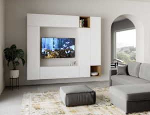 La parete attrezzata Isoka A32 è composta da tre elementi verticali, due elementi orizzontali e due cubi aperti, pensati per incorniciare la tua TV.