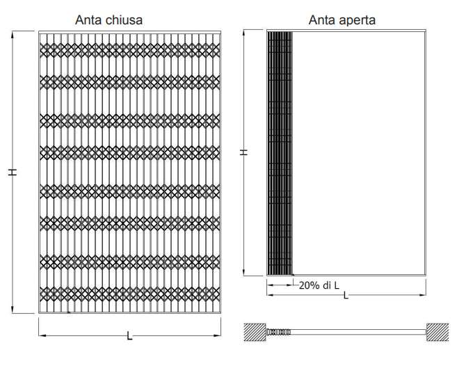Telo realizzato con profili in lamiera zincata sp. 1,2 mm ad ''U'' da 15x15x15 mm accoppiati verticalmente mediante pantografi in profilato piatto zincato , snodati ad onde con speciali perni ribattuti e relative boccole. Supporti superiori con doppie ruote in nylon con cuscinetti.