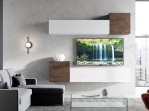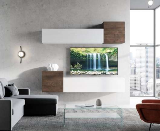 La parete attrezzata Isoka A37 è composta da due elementi semplici ripetuti in alto e in basso, sopra e sotto la TV.