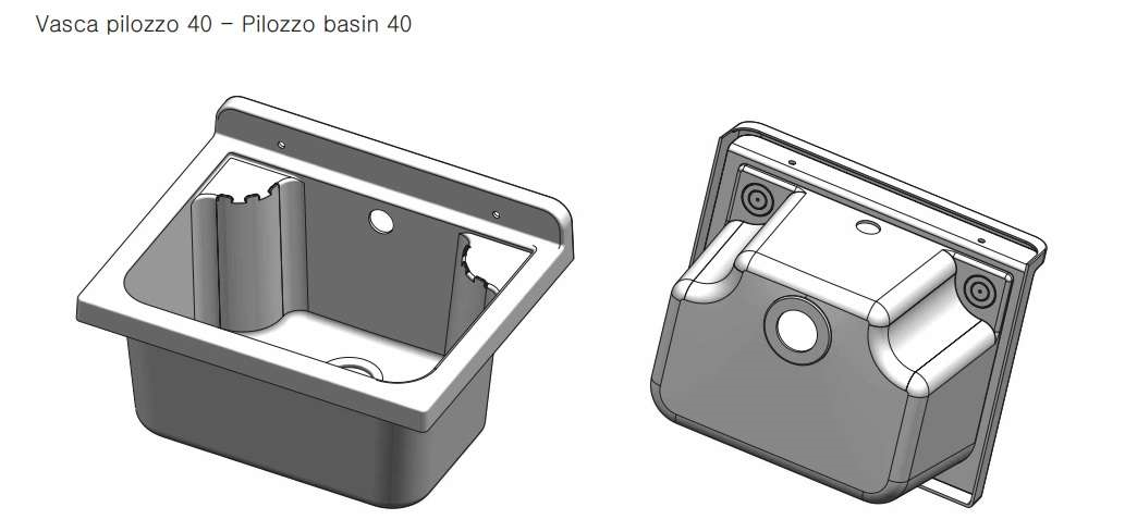 Dotazione Kit di fissaggio a parete Viti a testa esagonale Coprivite Doppia staffa di supporto Sifone con tubo estensibile con dado in plastica 1”1/4 e uscita Ø32 e Ø40 Piletta con troppopieno e tappo di copertura Griglia appoggiatutto su richiesta