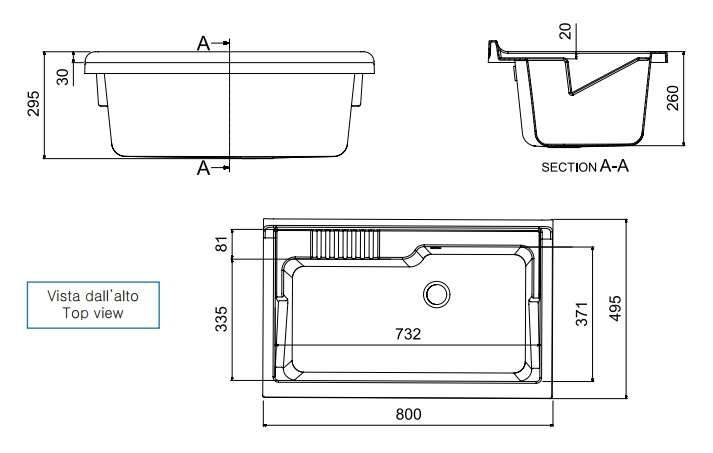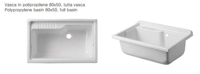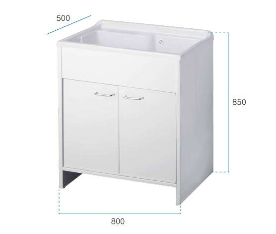 Mobile Lavanderia Per Interno ed Esterno 80x50x85 cm Mobile in PVC resistente all’acqua Antine piene con chiusura a battente Maniglie cromate Vasca in polipropilene resistente agli acidi di uso domestico Sifone autopulente completo di piletta e troppopieno Piedini regolabili in altezza 15 mm Vasca forabile per installazione rubinetto (rubinetto non incluso) Scarico sifone a 35÷45 cm da terra Adatto per esterni o luoghi umidi