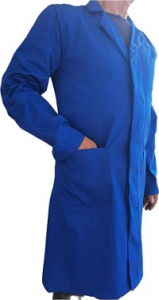 Il camice si presenta con chiusura frontale con bottoni e pattina di copertura. Due tasche laterali e una tasca sul petto.