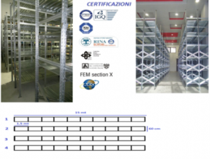Il tutto assemblato forma 4 scaffalature lunghezza 15 metri , altezza 3,00 mt , profondità 60 cm , formata ognuna da 10 elementi da 150 cm con 5 ripiani ognuno .