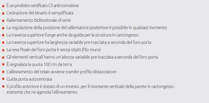 Telaio per porta scorrevole INTERAMENTE IN ALLUMINIO CON FINITURA FILO MURO L’UNICO TELAIO ILLUMINATO NEL MERCATO. 615/715/815 x 2000-2100 Spessore 75 mm Il Nostro telaio per porta a scorrimento progettato perarredare con eleganza qualsiasi ambiente abitativo oprofessionale. L’integrazione di una striscia LED all’interno del profilo anteriore garantisce un’illuminazione indiretta pulita e ricercata ai bordi della porta. La sua finitura filomuro, senza stipiti e coprifili, conferisce alla parete dove è installata la porta scorrevoleun aspetto essenziale che si integra perfettamente allospazio di arredo circostante. Il rallentatore bidirezionale, incluso di serie, accompagna l’apertura e la chiusuradella porta scorrevole. Questo telaio scorrevole è realizzato interamente inalluminio, risultando così la soluzione più adatta per l’installazione di porte scorrevoli in luoghi con alti tassi di umidità o salinità e in ambienti pubblici e/o sanitari