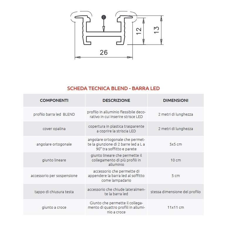 BLEND è un profilo in alluminio ideale per l’illuminazione con strisce LED che si può adattare e sagomare a qualsiasi tipo di supporto, che sia una parete o un soffitto, anche di forme curve. È flessibile ed adattabile, perquesto può anche diventare un’applique di design o essere appesa a sospensione come un lampadario. BLEND, una volta finita la veloce installazione, aderisce perfettamente alla lastra di cartongesso e questo permette di ottenere un risultato esteticamente gradevole e minimal, che segue le tendenze del momento. Il prodotto è completo di angolari a 90°, giunti di collegamento lineari e ad angolo retto che permettono la connessione tra i profili.