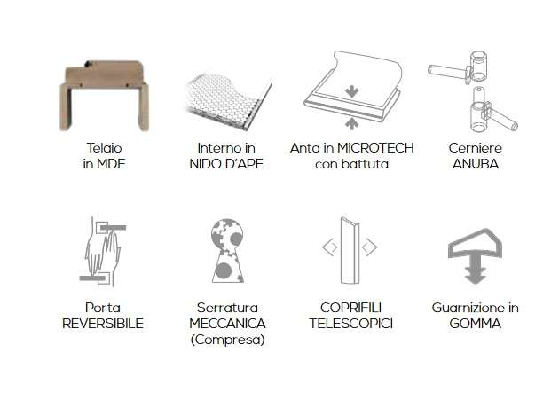 Composta da: • anta tamburata con struttura perimetrale in abete • anta con battuta spessore 44 mm • anta ferrata completa di serratura meccanica verniciata silver • telaio ferrato 100 mm con cerniere anuba reversibili • coprifili da 65 mm in MDF • dimensioni in altezza 2100 mm