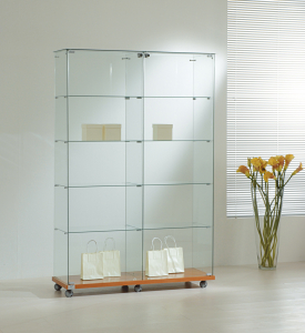 VETRINA Top Cristallo Temperato 5MM, Base in legno colore ciliegio, grigio o wengè a scelta, vetrina senza luci, vetrina h.180 cm, profondità 40 cm. Ripiani fissi a 33 cm di distanza.