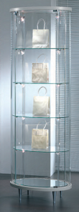 Vetrina ovale piccola cristalli temperati - ripiani regolabili in altezza - piedini H 13 cm - base a specchio - Dimensioni 64x44x190h - Con faretti a led 4000° K su due lati