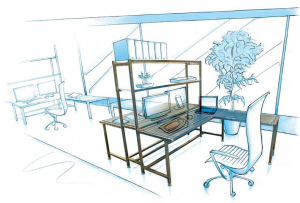 An ideal solution for a swift reorganisation of the office environment. This ergonomically designed stainless steel desk, side runner and integrated book shelf create an optimal environment for a work station with a “touch of design” provided by the blue PVC top.