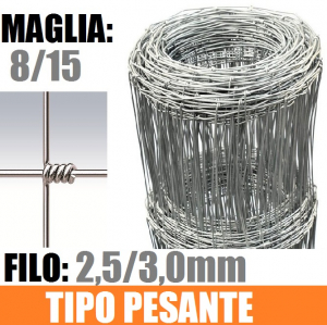 CONSEGNA 4/5 Giorni - MAGLIA: 8/15 -DIAMETRO FILO:mm2,5/3,0 - ALTEZZA RETE: 100 cm- rete metallica realizzata annodando il filo verticale su quello orizzontale. I fili verticali ed orizzontali della rete sono in acciaio a forte zincatura. L'impiego è rivolto alla recinzione di grandi aree ad uso agricolo e zootecnico. E' considerata una tra le reti più econimiche di tutta la gamma.