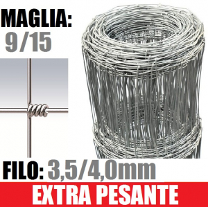 MAGLIA: 9/15 -DIAMETRO FILO:mm3,5/4,0 - ALTEZZA RETE: 120 cm- rete metallica realizzata annodando il filo verticale su quello orizzontale. I fili verticali ed orizzontali della rete sono in acciaio a forte zincatura. L'impiego è rivolto alla recinzione di grandi aree ad uso agricolo e zootecnico. E' considerata una tra le reti più econimiche di tutta la gamma.