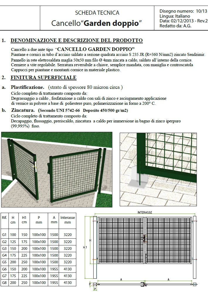 Pali di sostegno Compresi diametro: 100mm - Cancello a 2 battenti - È il tradizionale cancelletto che integra e completa la recinzione con pali e rete metallica. larghezza tot. cancello+ piantoni 425 cm circa. PRODOTTO MADE IN ITALY FINITURA: PFZ (Filo zincato + Fosfatazione ai sali di zinco + Plastificazione con poliestere): Il filo utilizzato per produrre questa rete è zincato a caldo in continuo in bagno di zinco per garantire la massima resistenza e durabilità nel tempo al prodotto. Successivamente, dopo aver assemblato il pannello, viene applicato il trattamento di Plastificazione PFZ che prevede 7 fasi di lavorazione che assicurano la migliore qualità del prodotto. La prima fase prevede il degrassaggio (1) per eliminare ogni residuo superficiale di olio, grasso e polvere. Successivamente un’ulteriore lavaggio (2) elimina altre eventuali impurità e residui del degrassaggio. A questo punto inizia il ciclo di fosfatazione : lavaggio con acqua demineralizzata (3) ed applicazione di fosfati di zinco (4). Il prodotto viene poi asciugato (5) in forno a 120° in preparazione alla successiva fase di plastificazione (6) con resine di poliestere puro al 100%. Attraverso la polimerizzazione (7) lo strato di poliestere viene fissato al supporto.