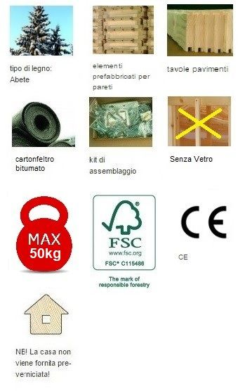 La casetta è fornita di cartonfeltro bitumato che se montato correttamente, garantisce una durata di circa due/ tre anni, conviene quindi acquistare e impermeabilizzare la casetta con una copertura di lunga durata come tegole bituminose, onduline, guaina ardesiata ecc. ecc.