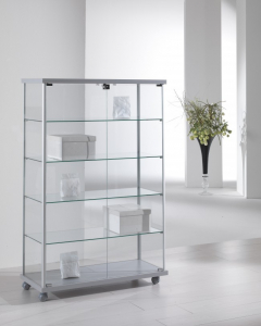 Vetrina con profili in alluminio – cristalli temperati – no. 2 ante battenti con serratura – no. 4 ripiani regolabili in altezza – top legno – base su ruote.PESO 81 kg DIMENSIONI 93 x 39 x 141 cm