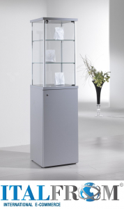 Vetrina con montanti in alluminio – cristalli temperati – no. 1 anta battenti con serratura – no. 2 ripiani regolabili in altezza – base in legno h 90 cm con anta battente e serratura.PESO 55 kg DIMENSIONI 45 x 45 x 175 cm