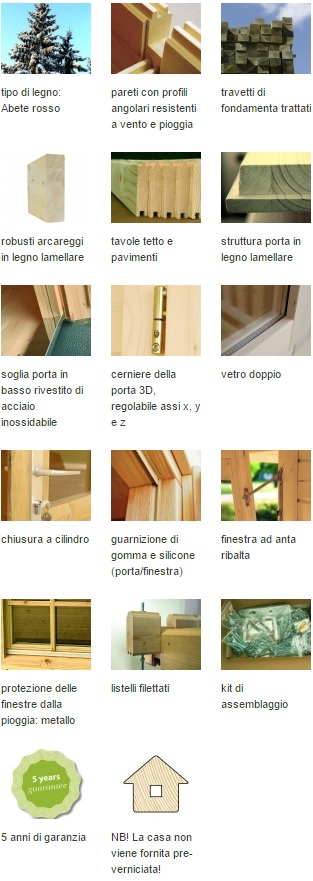 Tipo di porte : In legno abete rosso nordico lammellare doppio 3-9-3 mm - rivestita in acciao inossidabile - Chiusura a cilindro; Tipo di finestra : in legno massiccio abete ad anta ribalta, sistema 2-mani