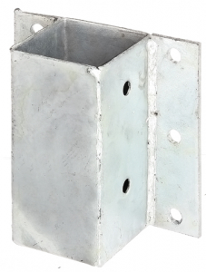 Staffa porta palo per cordoli a L , U e per muri in acciaio grezzo con superficie zincata a fuoco a tassellare per pali in legno quadri .