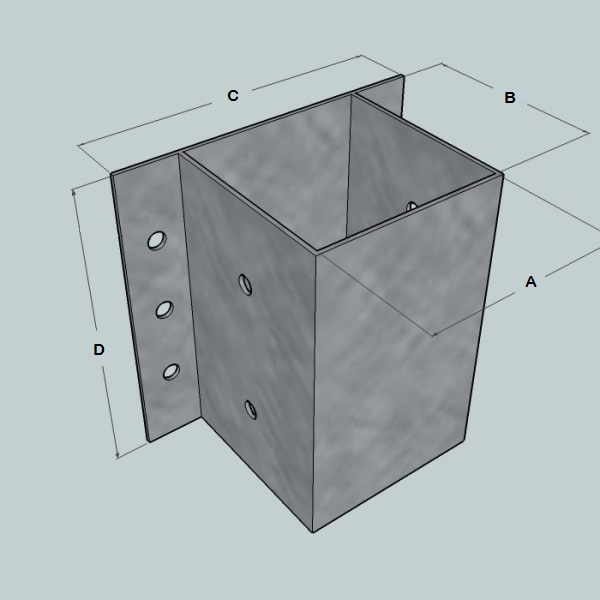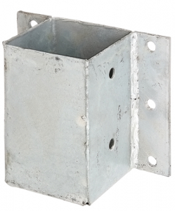 Staffa porta palo per cordoli a L , U e per muri in acciaio grezzo con superficie zincata a fuoco a tassellare per pali in legno quadri .
