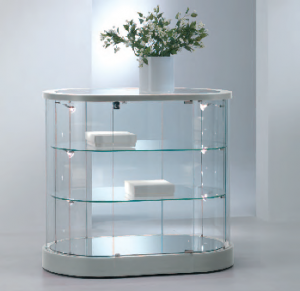 Banco Vetrina ovale cristalli temperati - ripiani regolabili in altezza - Basi e Top H 9 cm - Dimensioni 96 x 56 x h 87 cm - Con faretti a led 4000° K su due lati.