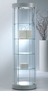 Vetrina Rotonda cristalli temperati - ripiani regolabili in altezza - Basi e Top H 9 cm - Diametro 71 cm - Altezza 190 cm - Con 4 faretti a led 4000° K.