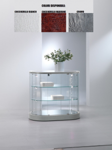 Banco Vetrina in ecopelle di forma ovale con cristalli temperati - ripiani regolabili in altezza - base con ruote - Dimensioni 96 x 56 x h 87 cm - Con faretti a led 4000° K su due lati.