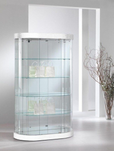 Vetrina semiovale in Ecopelle - cristalli temperati - ripiani regolabili in altezza - Basi e Top H 9 cm - Dimensioni 112 x 38 x h 190 cm - Con 3 faretti a led 4000° K.