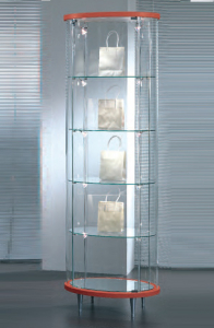 Vetrina ovale piccola cristalli temperati - ripiani regolabili in altezza - piedini H 13 cm - base a specchio - Dimensioni 64X44x190h cm - Con faretti a led 4000° K su due lati.