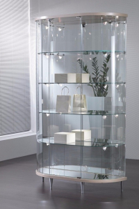 Vetrina semiovale a parete cristalli temperati - ripiani regolabili in altezza - piedini H 13 cm - base a specchio - Dimensioni 96X56x190h cm - Con faretti a led 4000° K su due lati.