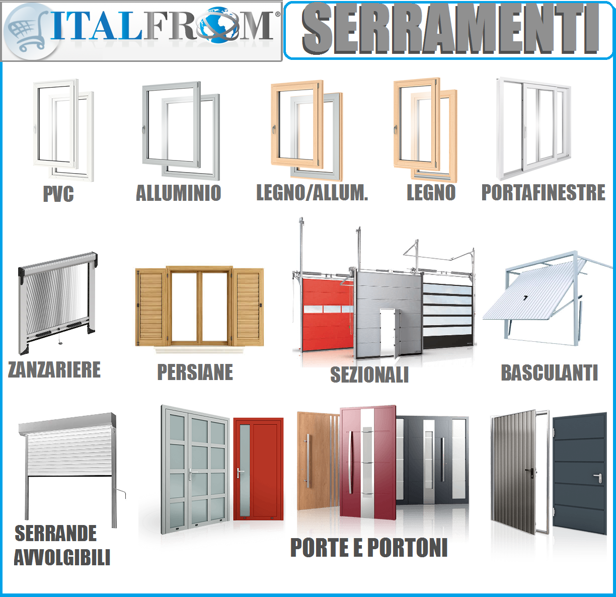 SERRAMENTI GARANTITI ITALFROMInfissi in PVC - Infissi in Alluminio - Infissi in Legno/Alluminio - Infissi In Legno - Porte interne - Portoni Blindati - Avvolgibili e Serrande - Pareti divisorie - Portoni sezionali e Basculanti industriali e residenziali - Zanzariere ecc....