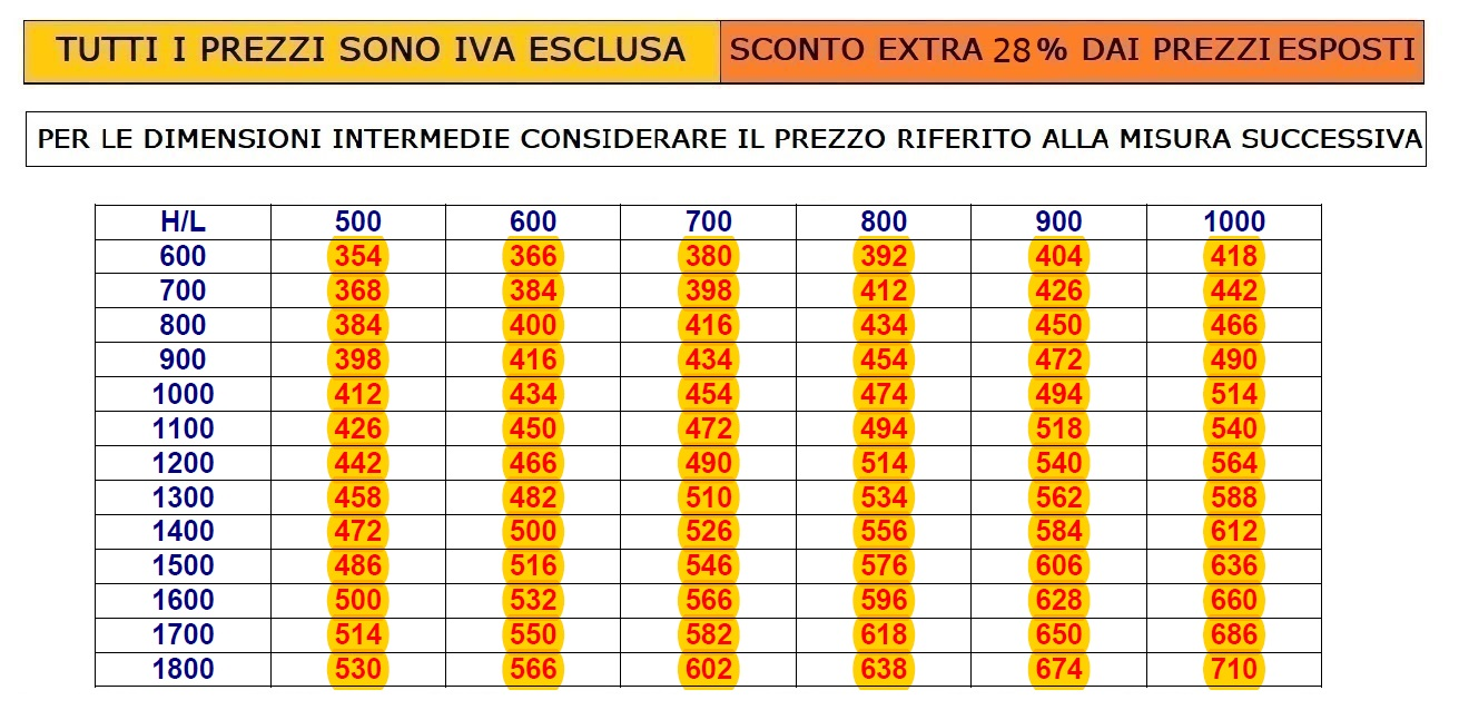 PER ULTERIORI MISURE CONSULTARE LA TABELLA SOTTO - COMPRESO TRASPORTO IN ITALIA- Per preventivi tecnici personalizzati siamo a tua disposizione, mail reparto: commerciale4@italfrom.com , Cellulare e/o Whatsapp (+39) 347.76.92.848 - Se richiesto SERVIZIO MONTAGGIO IN TUTTA ITALIA