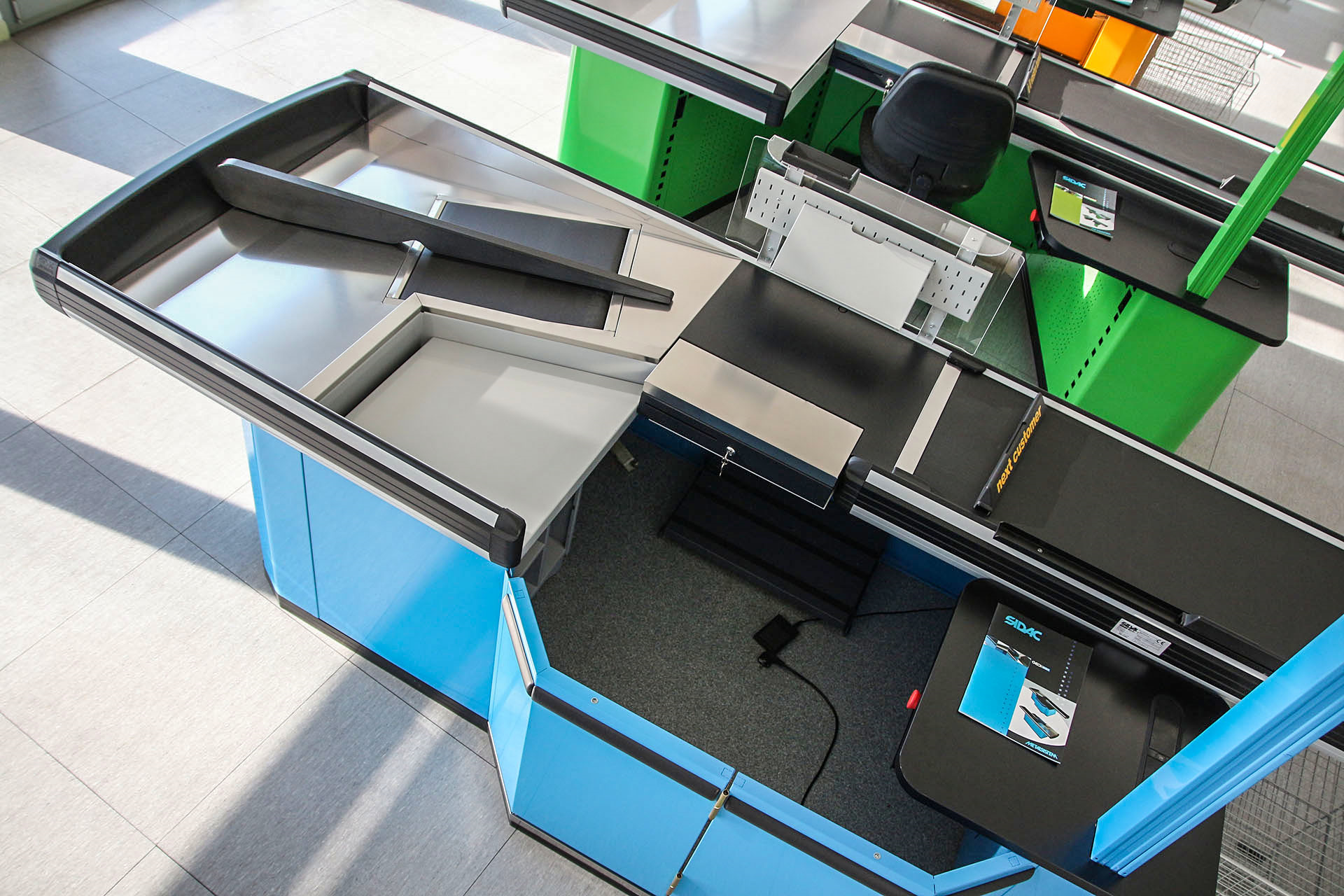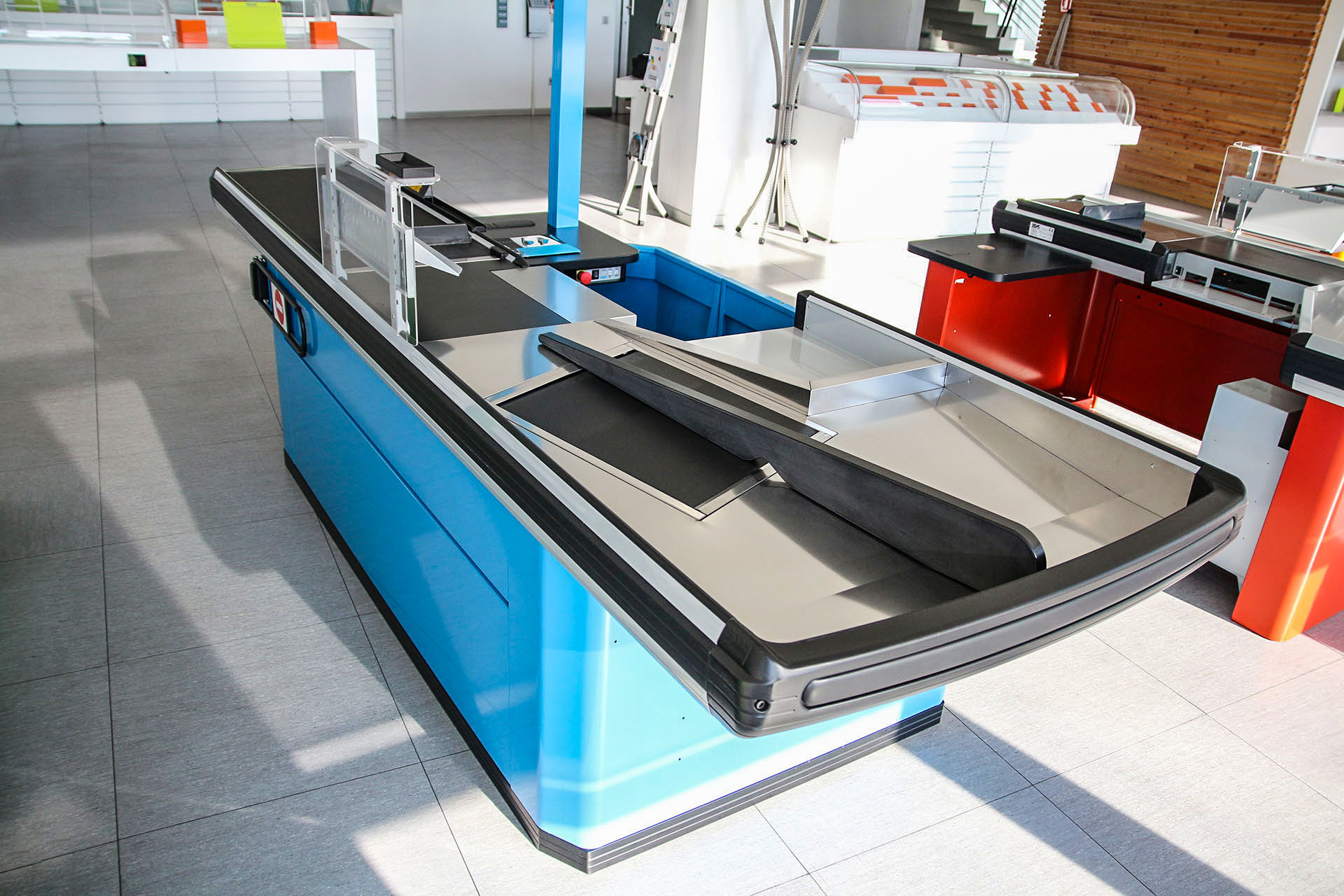 Banco cassa tradizionale adeguato per dimensione e funzione a tutte le aree vendita dal Superette o minimercato (superficie di vendita tra i 100 ed i 399 m²) all'Ipermercato (superficie di vendita superiore ai 2500 m²). L'ampiezza della vasca posteriore permette l'insacchettamento della merce per due clienti contemporaneamente ed offre quindi un adeguato servizio pur contenendo l'ingombro totale. La parte centrale - da 600 mm - permette l'alloggiamento dello scanner e del cassetto portamonete ribaltabile consentendo all'operatore di lavorare in posizione ergonomica e frontale rispetto al cliente.