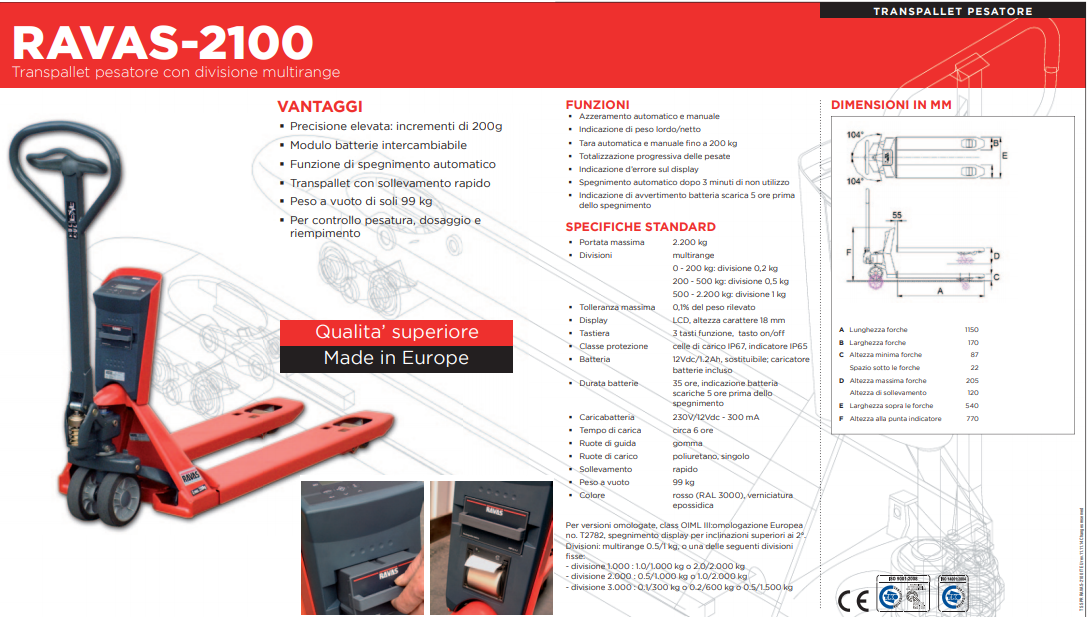 Il peso basso del transpallet manuale pesatore stesso lo rende facile da utilizzare e ergonomicamente attrattivo. Nel caso che un stampante è collegato, il peso separato e anche il peso totale vengono stampati sul scontrino. Tante opzioni sono disponibili: versione calibrate, versione antideflagrante certificata ATEX, versione inox, ecc. Il RAVAS-2100L è adatto per qualsiasi tipo di controllo preciso di peso come il controllo delle merci in entrata, la rilevazione del peso delle spedizioni, la prevenzione di sovraccarichi e il riempimento di fusti e di contenitori.