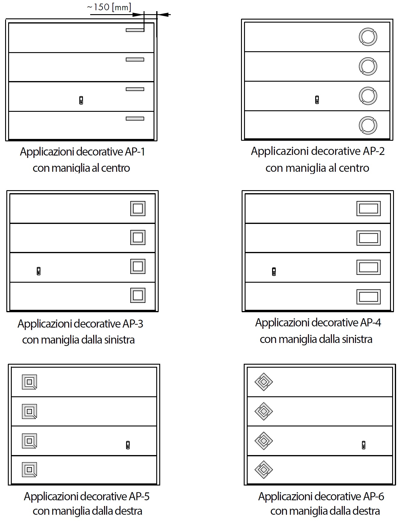 I Modelli di applicazioni disponibili nei portoni UniPro in dimensioni standard con pannello senza doghe con struttura liscia con microstampa, a effetto sabbia fine e liscia. Gli elementi sono realizzati in acciaio inox satinato. Senza possibilità di verniciatura. Disposizione sul portone - verticale. Nel portone senza maniglia - a scelta lato sinistro o destro, nel portone con maniglia - dal lato opposto a quello della maniglia. Nel portone con maniglia al centro - a scelta lato sinistro o destro.