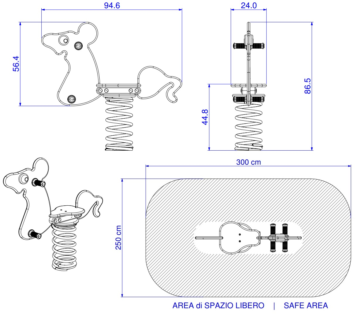 Questa variante indica il gioco a molla completo. Include la base per il fissaggio nel terreno tramite fondazione, la molla con diametro 180mm ed altezza 400mm, l'intera sagoma e tutta la viteria necessaria per il montaggio. Questo tipo di molla è solitamente usata in scuole, asili, giardini privati o parchi dove le strutture gioco sono supervisionate da genitori o insegnanti.