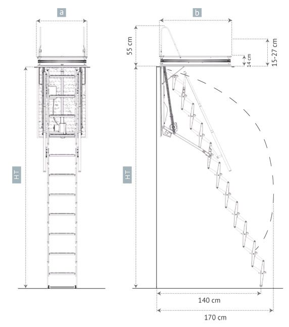 Per agevolare la salita e la discesa, è fornito un doppio corrimano telescopico zincato e sono previsti dei maniglioni di sbarco per facilitare l’uscita al piano superiore. La botola è costituita da un pannello in legno multistrato 15 mm di prima scelta a emissione minima di formaldeide (classe E1 norma UNI EN 13986:2005).