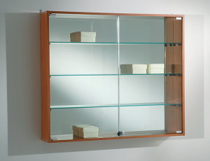 Bacheca in Cristallo Temperato 5MM e schienale a specchio. Vetrina pensile in legno colore ciliegio, grigio o wengè a scelta. Bacheca senza luci con altezza 81 cm, profondità 15 cm. Ante con serratura.