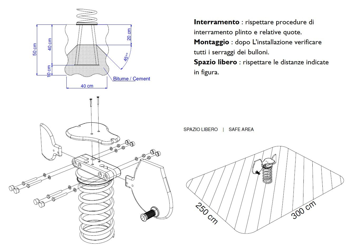 Questa variante indica il gioco a molla completo. Include la base per il fissaggio nel terreno tramite fondazione (art. 116 del listino), la molla con diamentro 200mm ed altezza 400mm, l'intera sagoma e tutta la viteria necessaria per il montaggio.Questo tipo di molla è solitamente usata per aree pubbliche o parchi dove le strutture gioco non sono supervisionate.