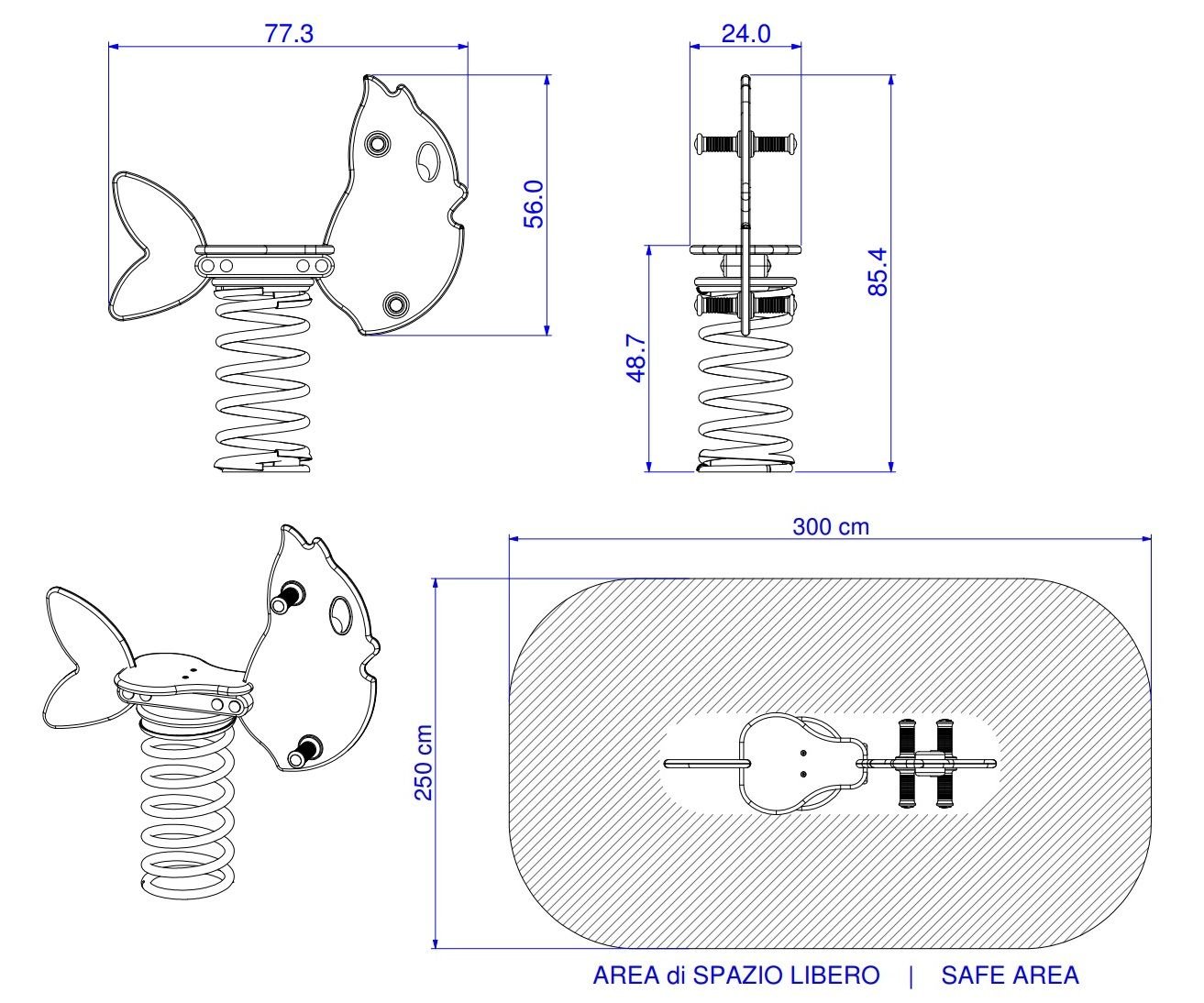 Questa variante indica il gioco a molla completo. Include la base per il fissaggio su superfici rigide come cemento (art. 125 del listino), la molla con diametro 200mm ed altezza 400mm, l'intera sagoma e tutta la viteria necessaria per il montaggio.