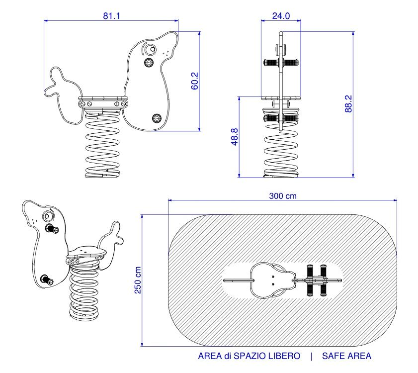 Questa variante indica il gioco a molla completo. Include la base per il fissaggio nel terreno tramite fondazione (art. 116 del listino), la molla con diametro 180mm ed altezza 360mm, l'intera sagoma e tutta la viteria necessaria per il montaggio. Questo tipo di molla è solitamente usata in scuole, asili, giardini privati o parchi dove le strutture gioco sono supervisionate da genitori o insegnanti.