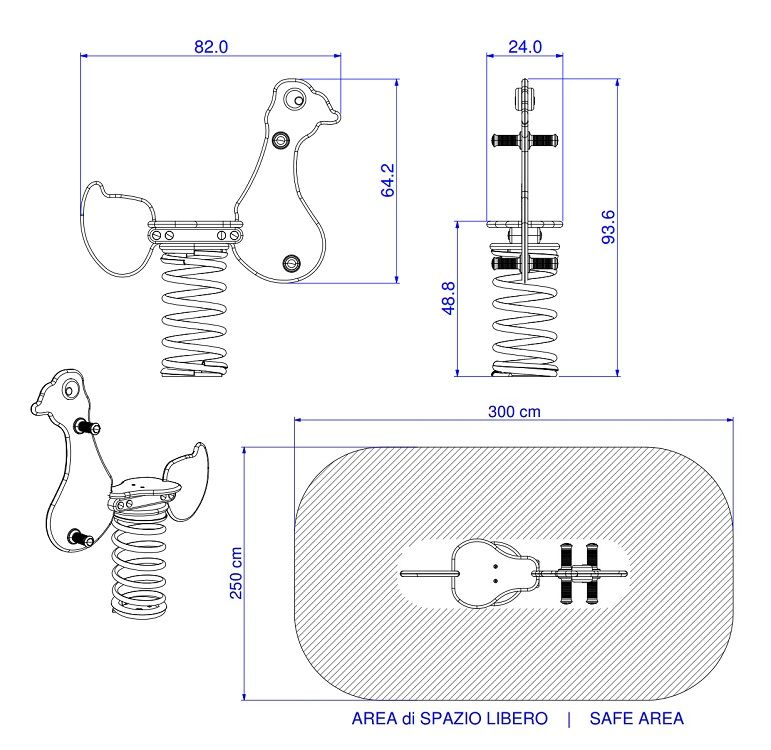 Questa variante indica il gioco a molla completo. Include la base per il fissaggio nel terreno tramite fondazione (art. 116 del listino), la molla con diametro 180mm ed altezza 360mm, l'intera sagoma e tutta la viteria necessaria per il montaggio. Questo tipo di molla è solitamente usata in scuole, asili, giardini privati o parchi dove le strutture gioco sono supervisionate da genitori o insegnanti.