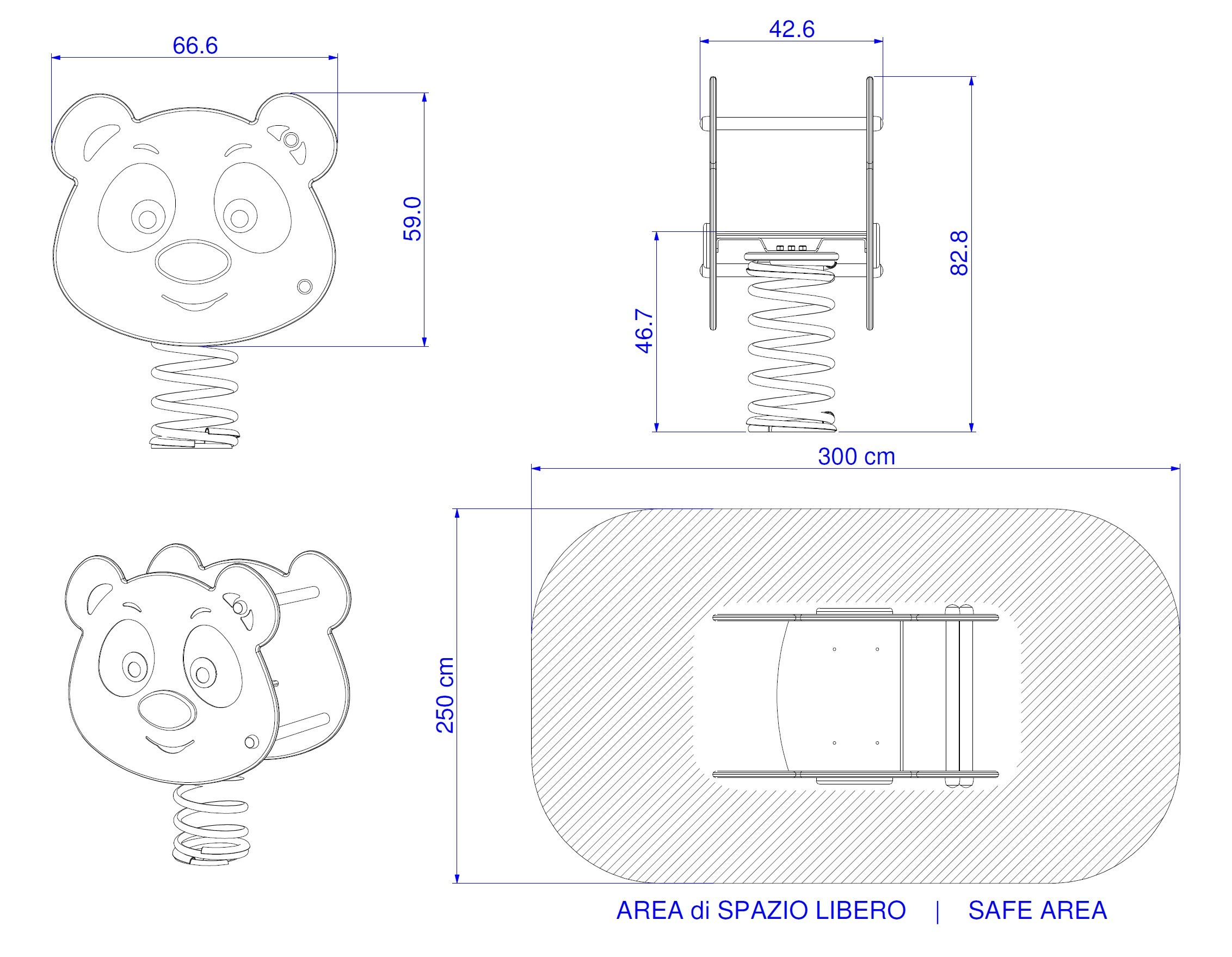 Questa variante indica il gioco a molla completo. Include la base per il fissaggio su superfici rigide come cemento (art. 125 del listino), la molla con diametro 200mm ed altezza 400mm, l'intera sagoma e tutta la viteria necessaria per il montaggio.