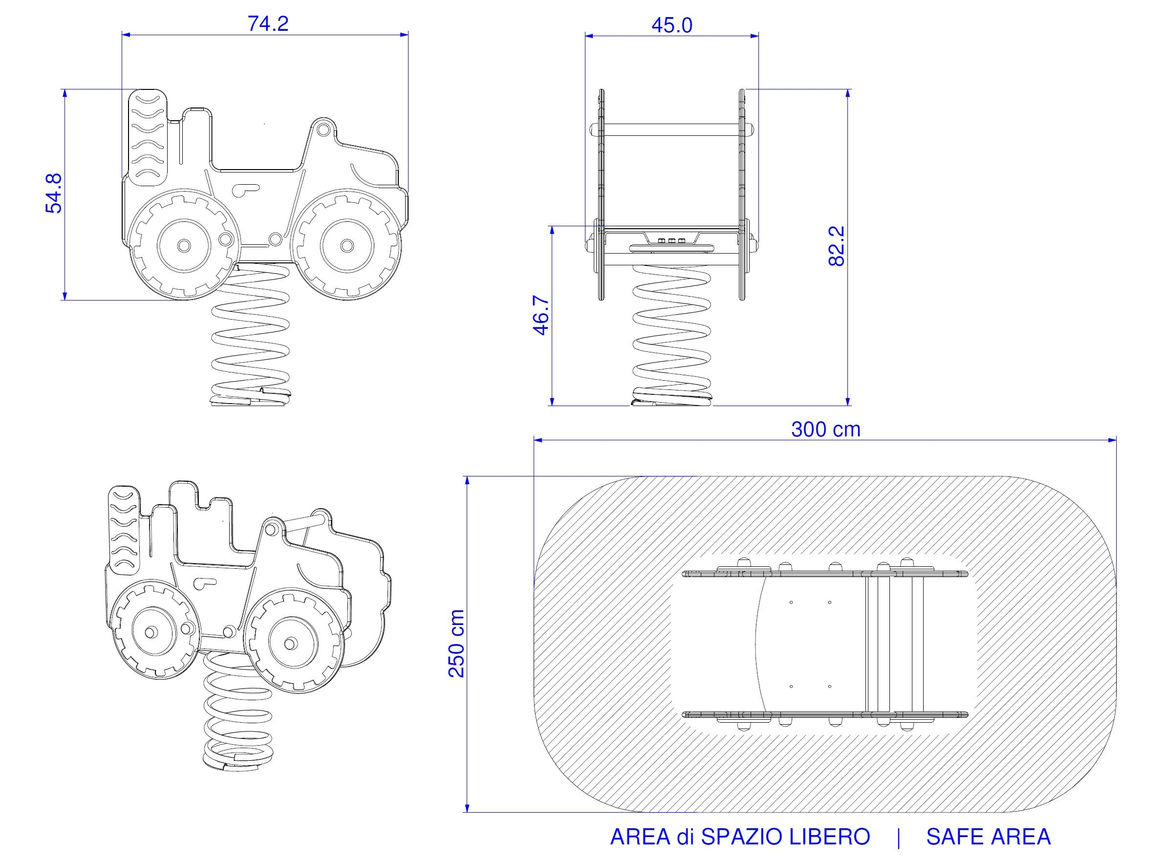 Questo tipo di molla è solitamente usata per aree pubbliche o parchi dove le strutture gioco non sono supervisionate.La viteria per il fissaggio a terra non viene fornita. Essa dipende dalla tipologia di superficie e viene solitamente scelta dall'installatore.