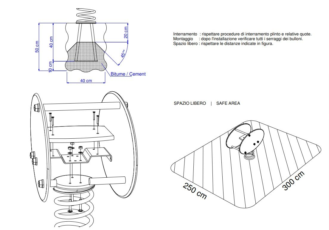 Questo tipo di molla è solitamente usata per aree pubbliche o parchi dove le strutture gioco non sono supervisionate.La viteria per il fissaggio a terra non viene fornita. Essa dipende dalla tipologia di superficie e viene solitamente scelta dall'installatore.