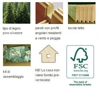 La casetta deve essere installata su una base stabile e indeformabile, in un luogo sopraelevato, che permetta il drenaggio dell’acqua piovana. Al riparo dagli spruzzi dell’eventuale impianto di irrigazione. A dovuta distanza di siepi verdi che impediscano la naturale traspirazione del legno. Normalmente la casetta viene consegnata con un mezzo pesante; se l’imballo è integro la casetta può rimanere all’esterno qualche giorno; (massimo una settimana) a condizione che sia poggiata su una base perfettamente in piano. Prima di iniziare il montaggio, leggere attentamente le istruzioni di montaggio; Per garantire lunga vita alla vostra casetta è consigliabile, prima di iniziare il montaggio, applicare una mano di impregnante (trasparente o molto chiaro) su tutte le tavole e i listelli che la compongono.