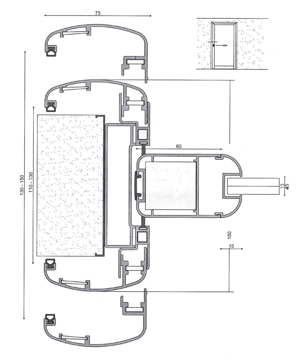 Telaio Porta: composto da cornice alluminio zeta 68 mm e zoccolo 146 mm.