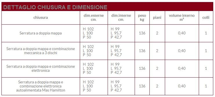 Per tutti i modelli il sistema può essere integrato da combinazione numerica a 3 dischi coassiali formante un milione di combinazioni, da combinazione elettronica, oppure da combinazione elettronica autoalimentata "Mas Hamilton". Le suddette serrature sono protette da una piastra di acciaio al manganese imperforabile al trapano..