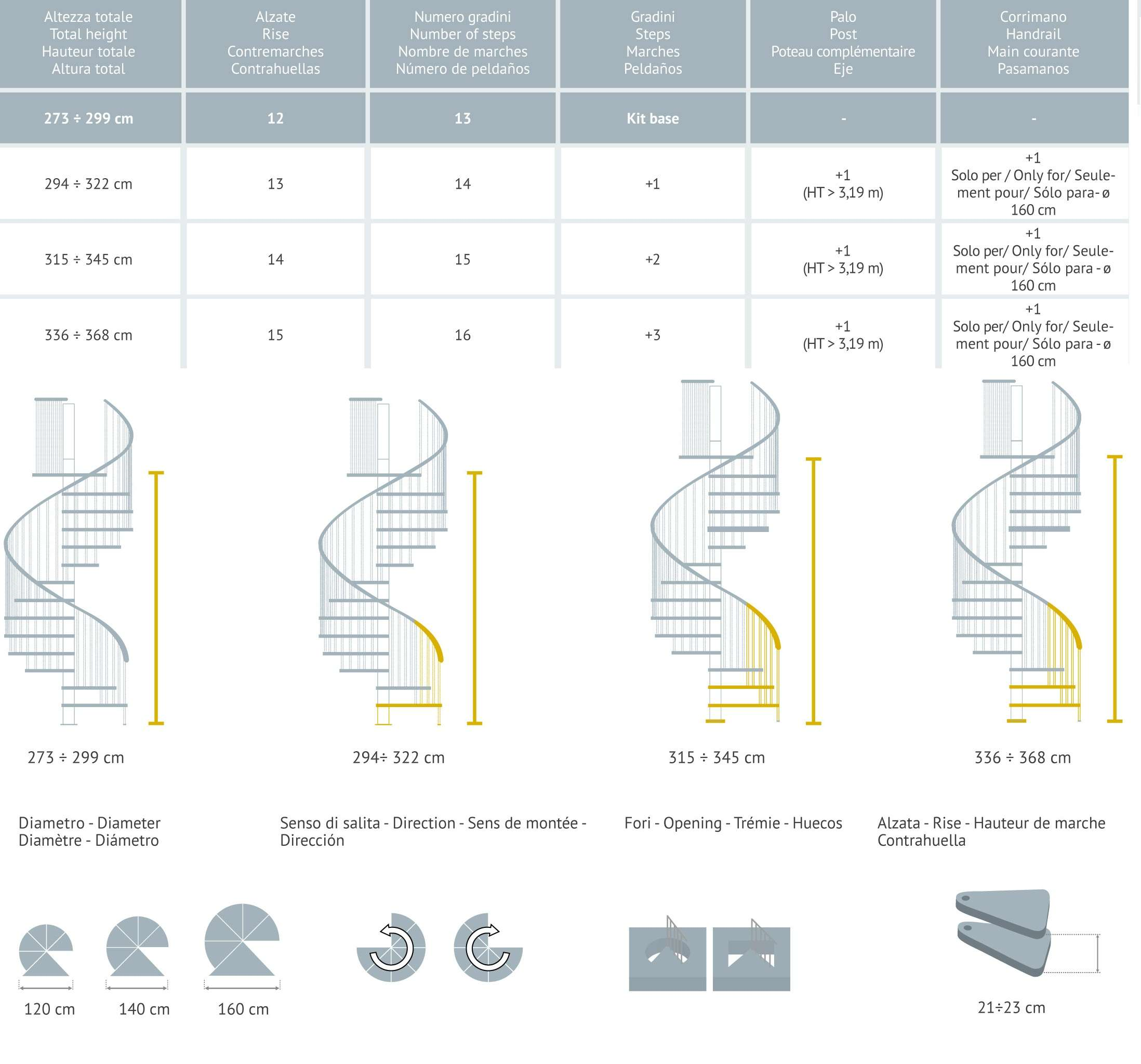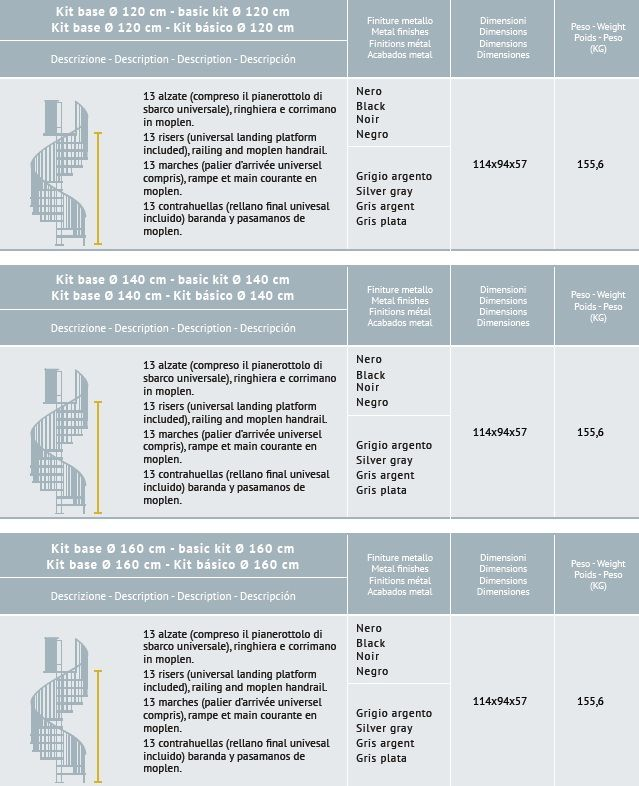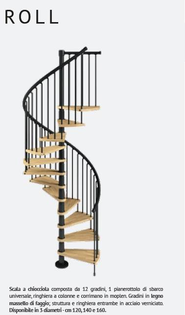 La scala a chiocciola è disponibile in 3 diametri (cm 120, 140 e 160) e può essere installata in senso orario o antiorario.